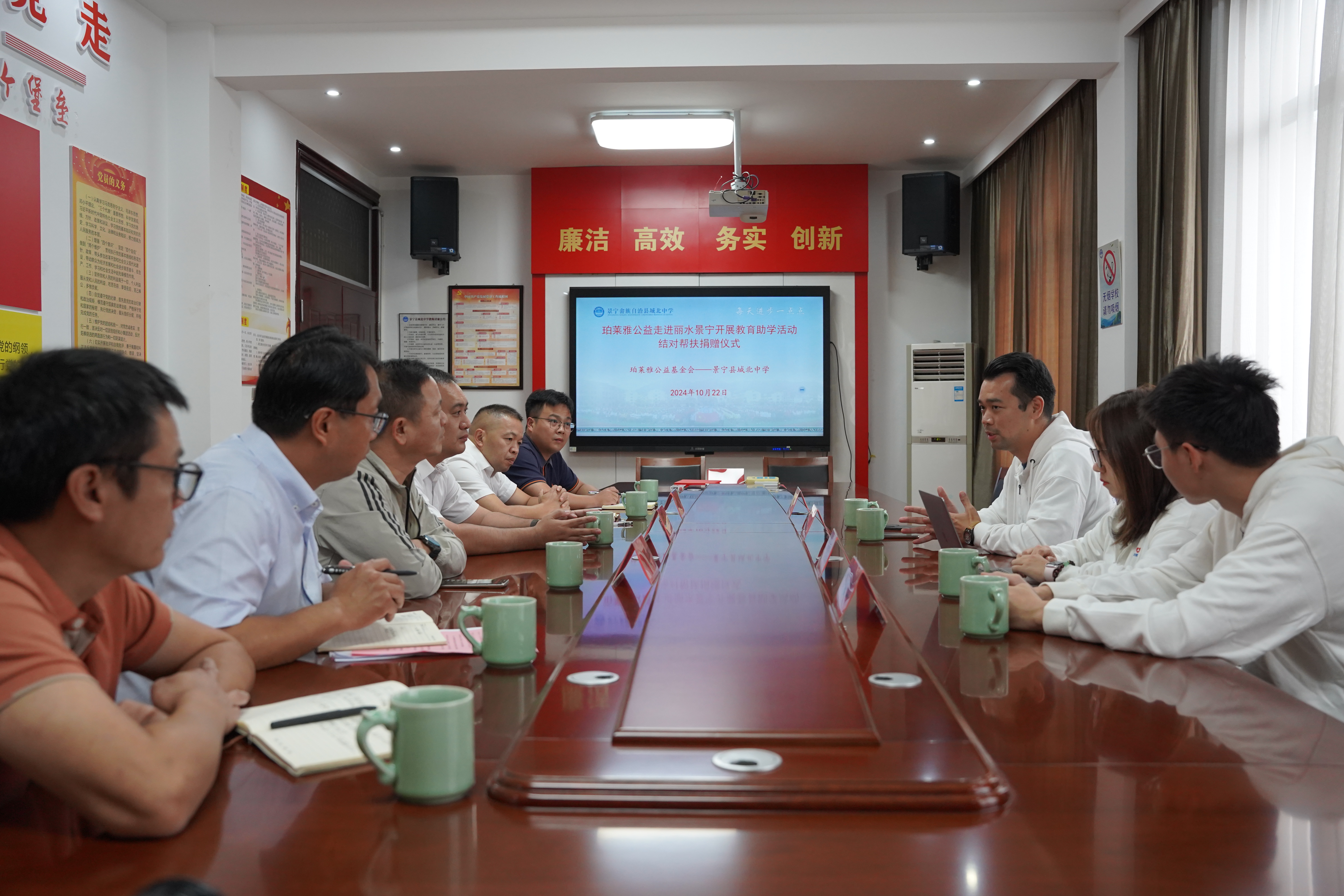 10月22日下午,珀莱雅公益团队一行人在景宁县共同富裕领导小组副组长,阿里巴巴驻景宁乡村特派员梁玉,景宁县教育局党组副书记、副局长金益华等领导的陪同下来到城北中学开展结对帮扶捐赠仪式。梁玉对珀莱雅公益团队的响应速度表示大力赞赏,并介绍了近年来景宁教育向好发展的整体情况。城北中学副书记、副校长蓝庆淼介绍了学校近年来取得的优异办学成果,并对学校困难学生的基本情况进行了概述。