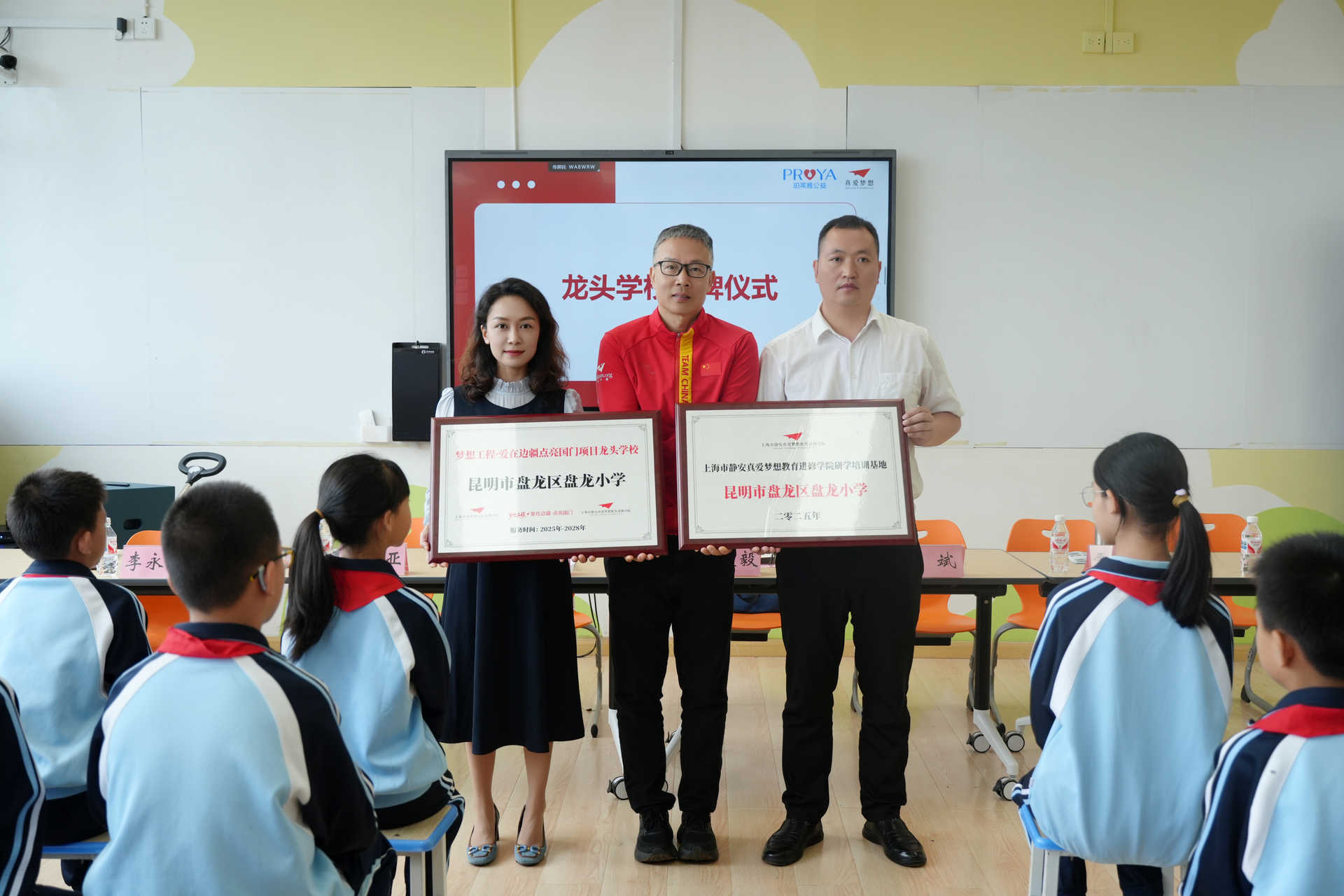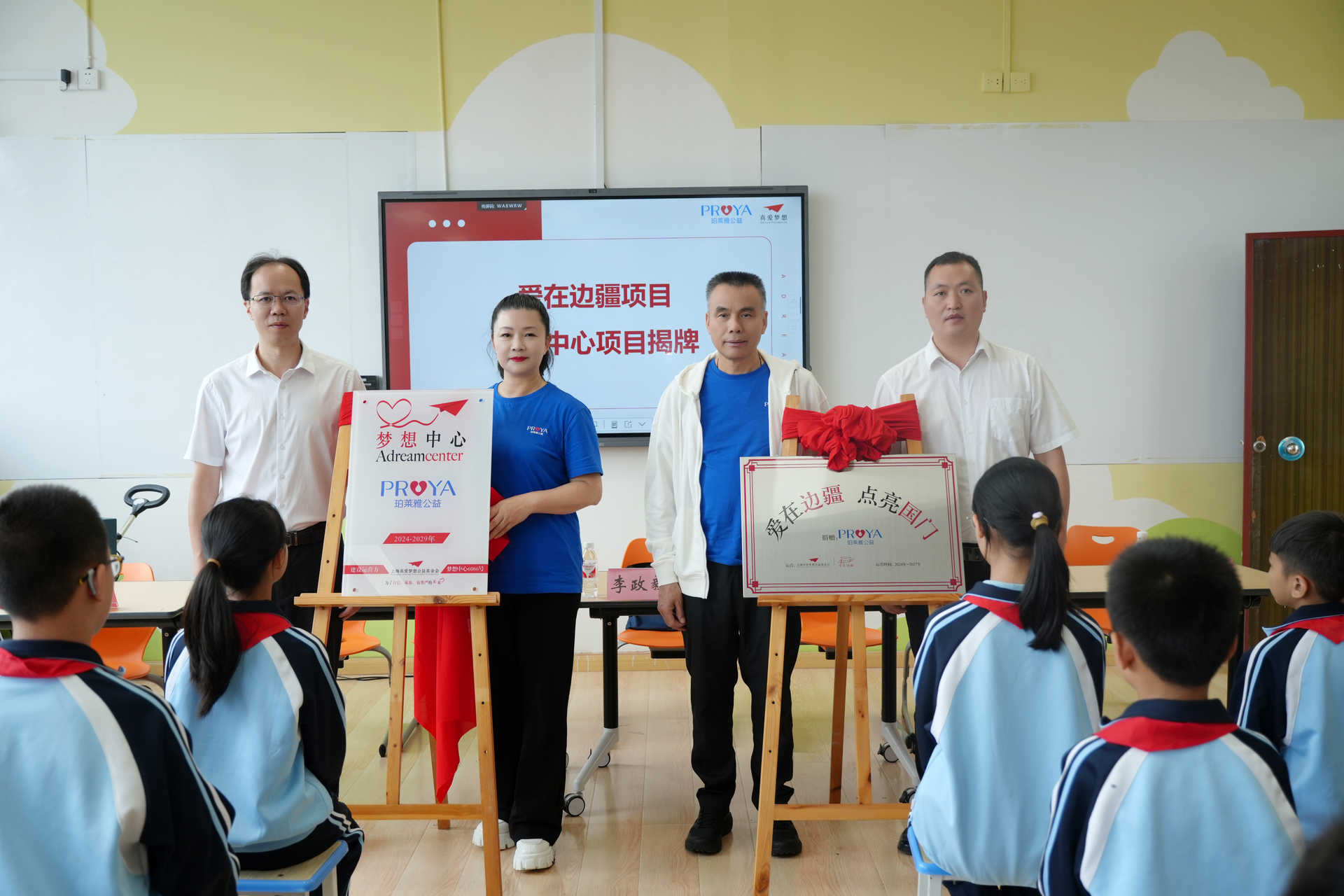 富宁县教体局李局长、第四小学鲁校长、昆明盘龙小学马校长、真爱梦想团队以及珀莱雅员工代表、珀莱雅公益生态伙伴等一同见证珀莱雅第三所国门学校的揭牌落地。李局长在致辞中指出:“‘爱在边疆·点亮国门’项目是珀莱雅公益携手真爱梦想共同响应国家战略、汇聚社会力量打造的边疆教育帮扶工程,通过建设国门标杆学校辐射优质教育资源,不断激活当地教育生态,推动义务教育优质均衡发展。”方爱琴理事长和公益生态伙伴代表将“爱在边疆·点亮国门”和“梦想中心”两块项目授牌传递给校方,标志着项目全面启动。