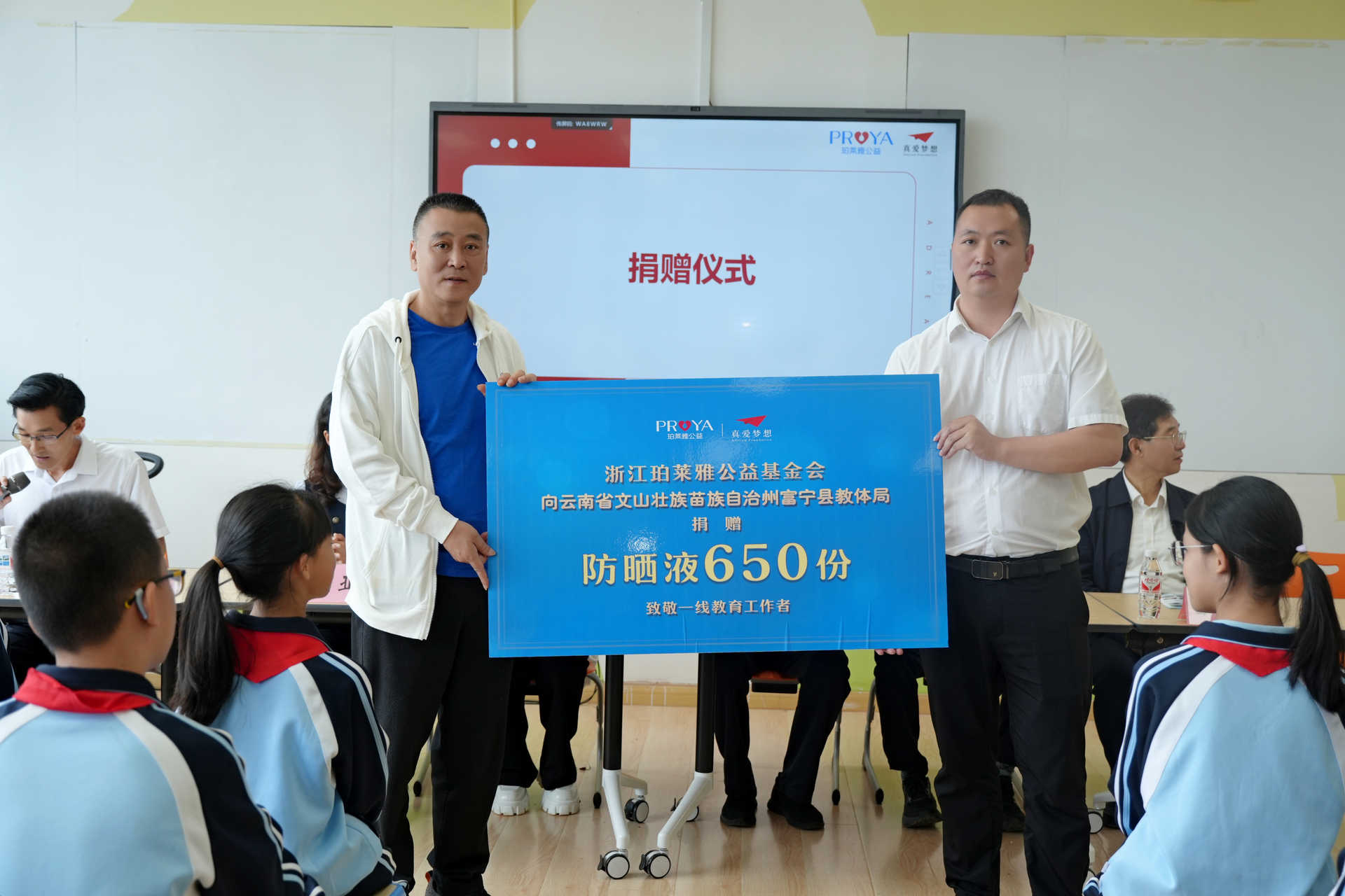 珀莱雅公益向富宁县教体局捐赠650份防晒液,致敬一线教育工作者的坚守与奉献。富宁四小的学生回赠了一幅珍贵的坡芽歌书画作,并为每一位远道而来的嘉宾献上壮族特色香包。十六名穿着壮族特色服饰的学生带来一场坡芽歌书表演,用歌声展现壮族最优美的篇章。