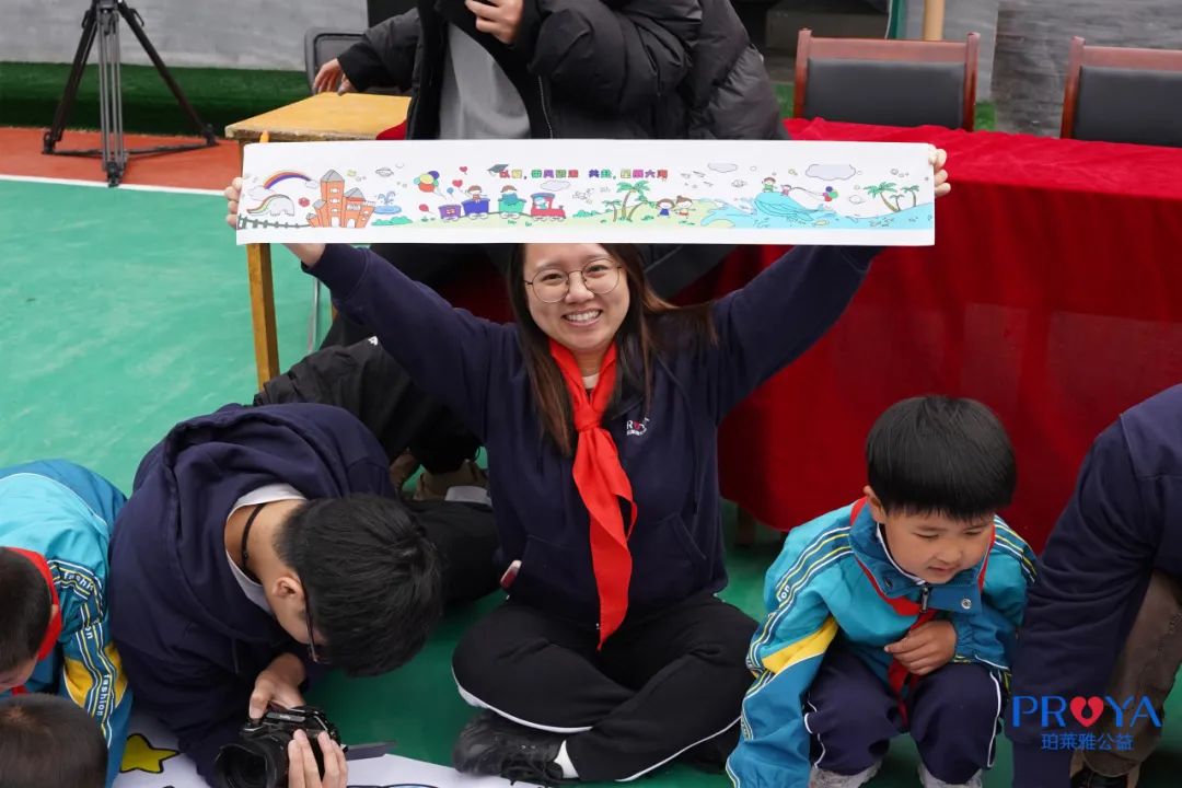 在周一升旗仪式奏唱国歌后,学生们为参与本次仪式的领导和嘉宾佩戴上鲜艳的红领巾。同时,学校还为珀莱雅公益基金会赠送了锦旗表达感恩之情。