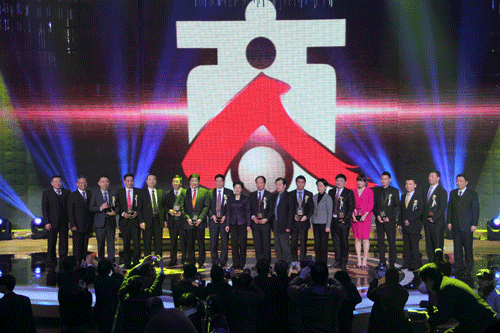 2012年度风云浙商与领导合影留念 同时当选的还有:巨星控股集团董事长仇建平、杭州老板电器董事长任建华、浙江精功集团董事长金良顺、杭州宏胜饮料集团总裁宗馥莉、今飞控股集团董事长葛炳灶、广厦控股集团董事局主席楼明、奥康鞋业董事长王振滔、浙江海正药业董事长白骅、广博集团董事长王利平。
