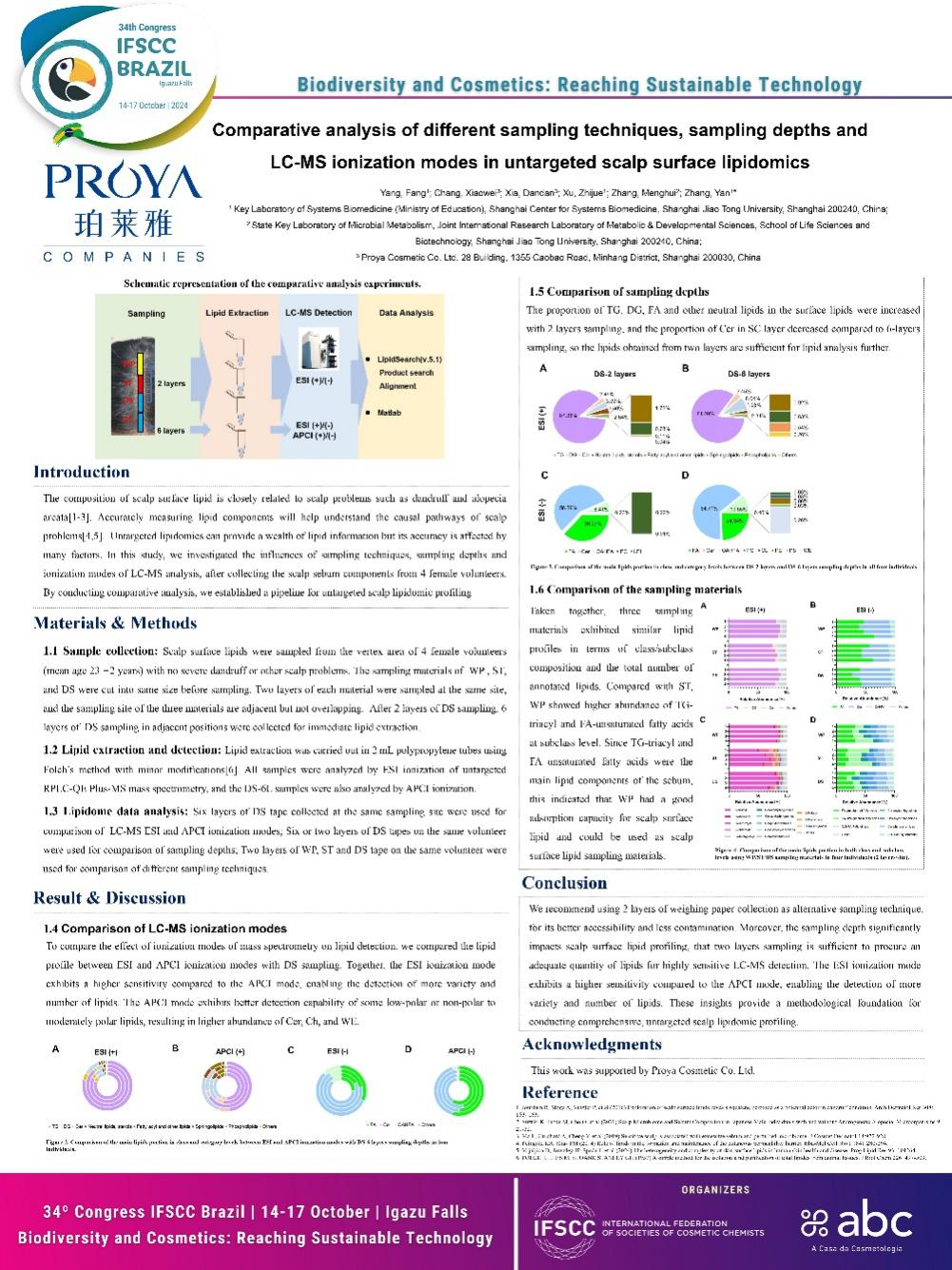 值得一提的是,前不久,珀莱雅上海头部护理研发中心同上海交通大学头皮微生态研究专家团队,共同在IFSCC(国际化妆品科学技术联盟)大会上,发表了题为《非靶向头皮表面脂质组学中不同采样技术、采样深度和LC-MS电离模式的比较分析》的创新研究成果,获得了专家的高度认可,也为后续脂质组学的研究奠定了基础。
