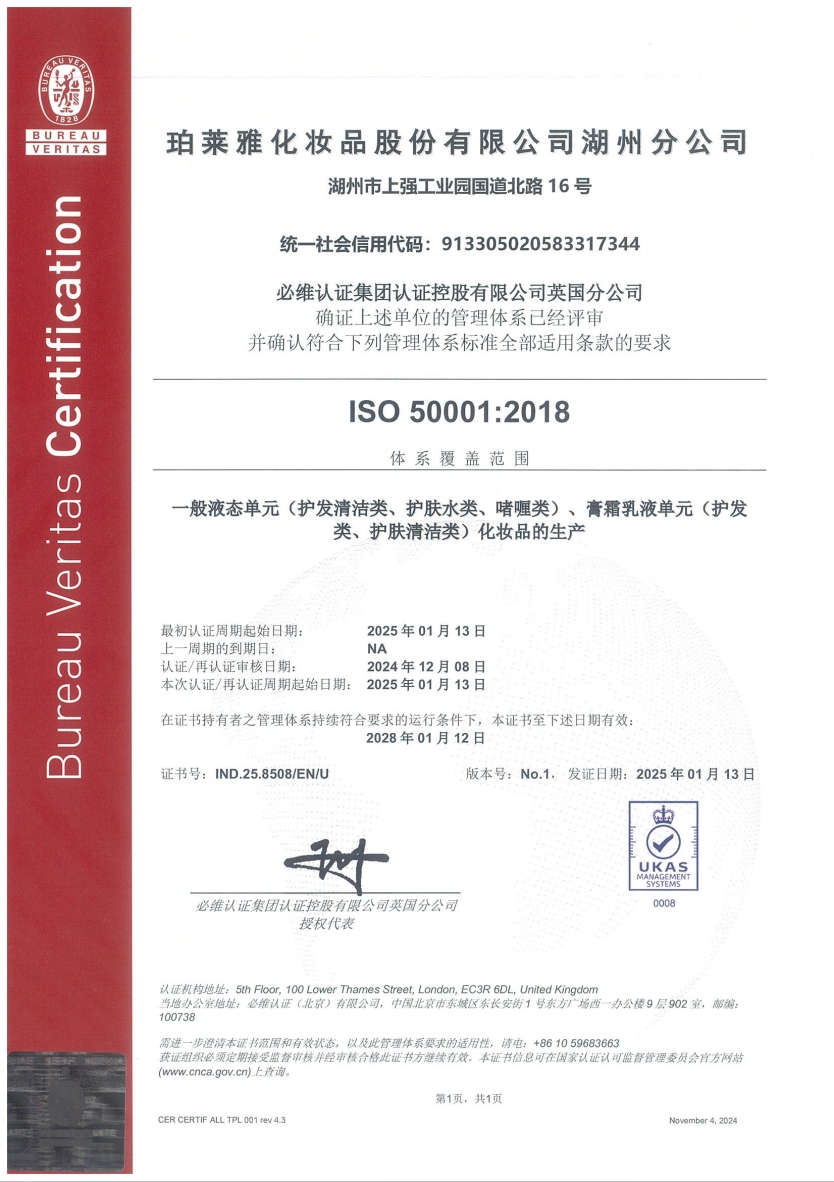 珀莱雅获RSPO供应链认证证书(来源:Bureau Veritas)