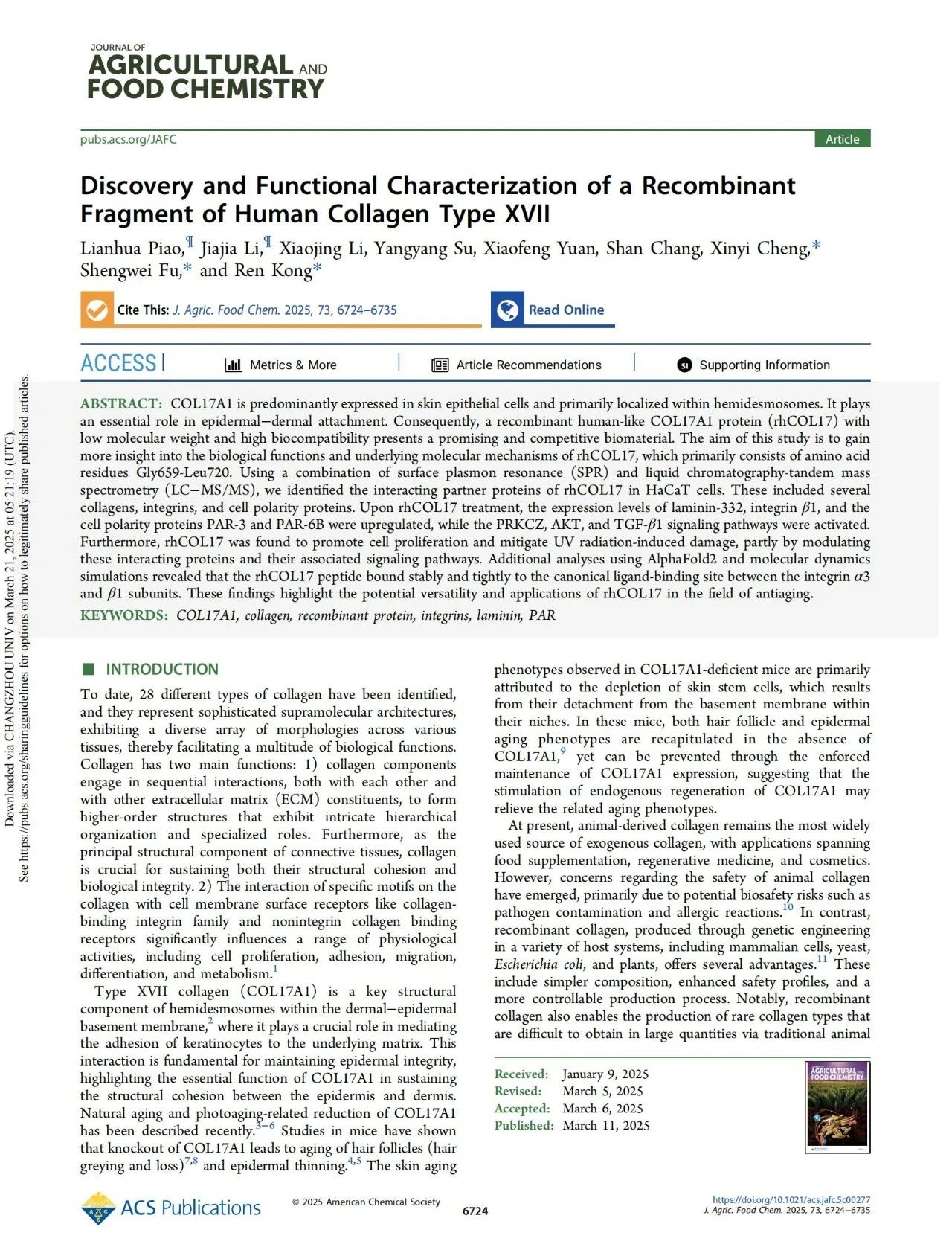 在火热的重组胶原蛋白领域,珀莱雅和创健医疗合作共研基底膜修护关键原料重组XVII型胶原蛋白。近期,创健医疗联合江苏理工学院和珀莱雅共同完成的重磅研究成果《Discovery and Functional Characterization of a Recombinant Fragment of Human Collagen Type XVII》已在国际权威期刊《Journal of Agricultural and Food Chemistry》(SCI一区)刊登。