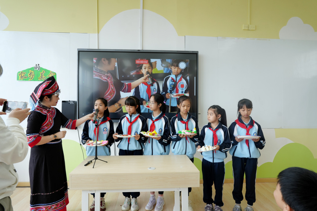 壮族麻蛋、剥隘烤鸭、五色糯米饭,孩子们用彩泥制作出了“香喷喷”的家乡菜。忍不住想咬一口,真是太像了!按照课程设置,制作完毕后,每个小组派代表上台进行了推介,他们对家乡真的好了解。不用去问,在他们稚嫩的脸庞上就能感受那份自信与从容。