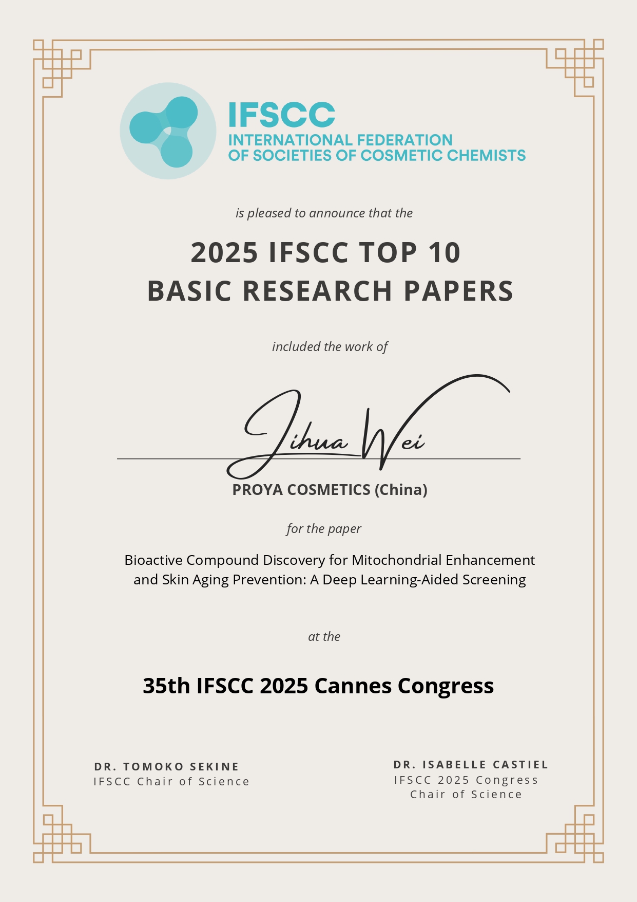与浙江大学药学院已经围绕“皮肤抗衰老”与“皮肤屏障修护”两大核心方向,开展了一系列原料机理研究与配方验证的合作,在积累丰富研究经验的同时,也取得了多项阶段性研究成果。其中,双方针对Cellergy pro™成分组在调控线粒体功能等方面的抗衰作用与机制展开研究,相关研究成果荣获第35届IFSCC大会“十大基础研究奖”。