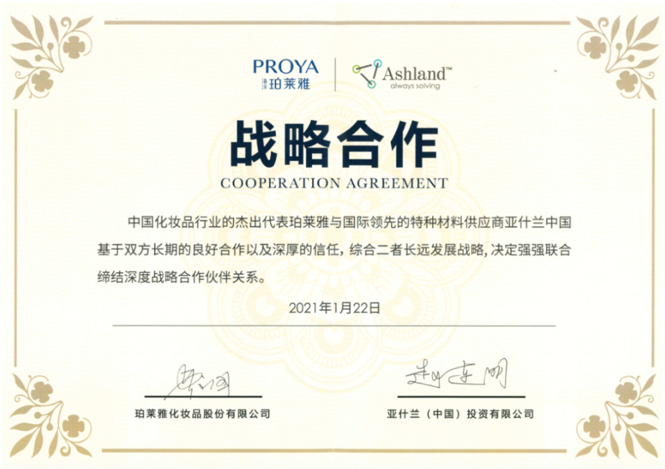 而作为国内本土品牌的领军企业,珀莱雅与亚什兰此次战略合作协议的签署,也将按计划开展多项深度技术合作。