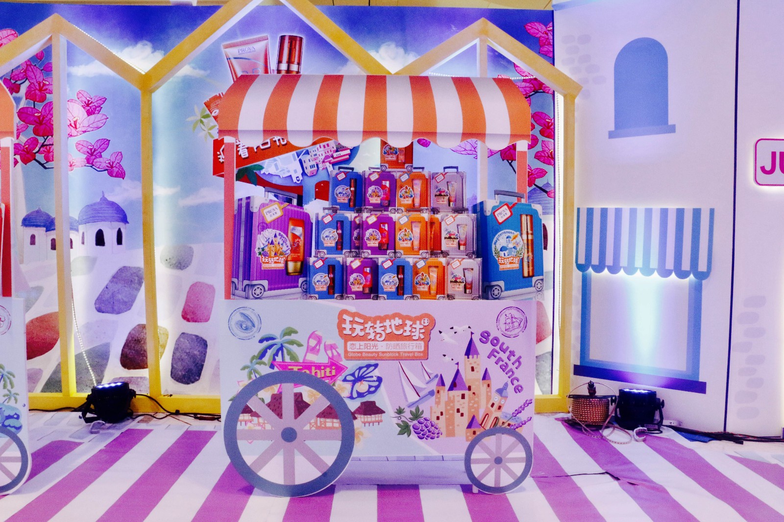 外场布置充满了地中海风情,蓝与白的纯美色彩、拱形的浪漫空间、蔚蓝的风情大海,让你宛若走进地中海小镇,忍不住坐下来品一杯拿铁小憩。内场布置更是弹力十足。全场充盈着大大小小不同的紫色弹力球,Q弹有力,犹如年轻肌肤般一触即弹!一股弹润活力的气息扑面袭来。