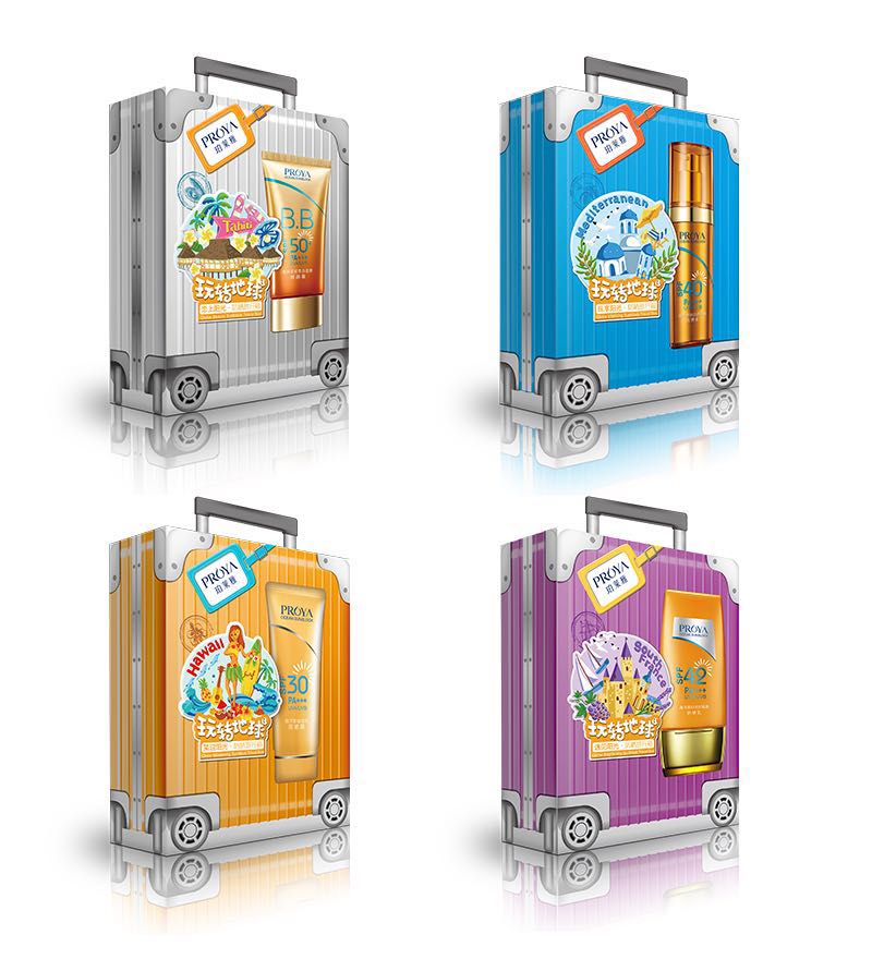 升级版防晒产品,四款创意旅行箱带你尽享大溪地、地中海、夏威夷、南法的旖旎风情。迎着阳光,玩转地球。实现了广大年轻女性追求轻松旅行,不畏阳光,同时保持防晒、补水、美白的梦想!
